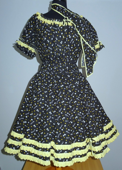 Bluse: runder Halsausschnitt mit Gummizug 20 cm kurze Puffärmelchen mit Gummizug um den Halsausschnitt und den Ärmelchen befindet sich ein gelbes Volant und ein gelbes Schleifchen