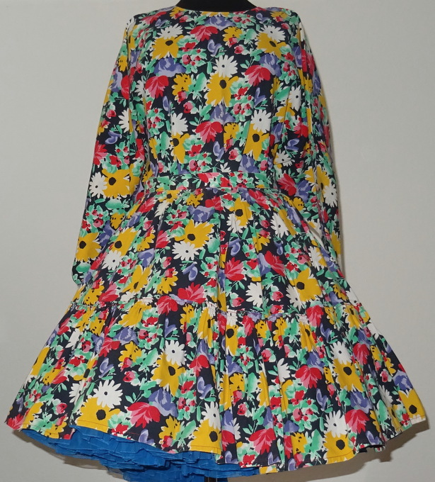 Rock: weitschwingender und faltenreicher Tellerrock 2,5 cm breiter starrer Bund oben durch Knöpfe zu schließen und 2 mal verstellbar unten befindet sich ein 24 cm breites Volant