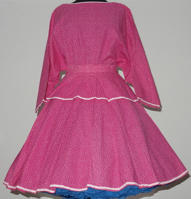 Rock: weitschwingender Tellerrock eingefasst mit weißem Verzierband oben mit einem 15 cm breiten Volant 3,5 cm starrer Bund mit Knopf zu schließen