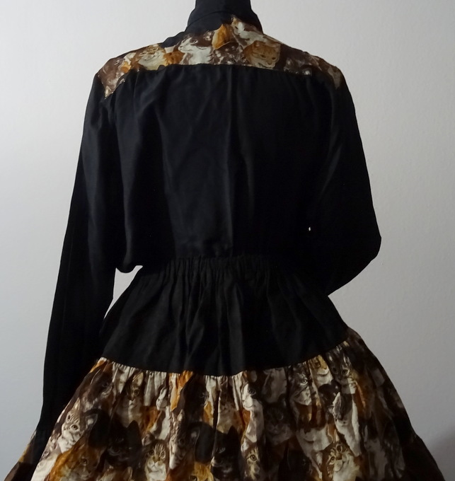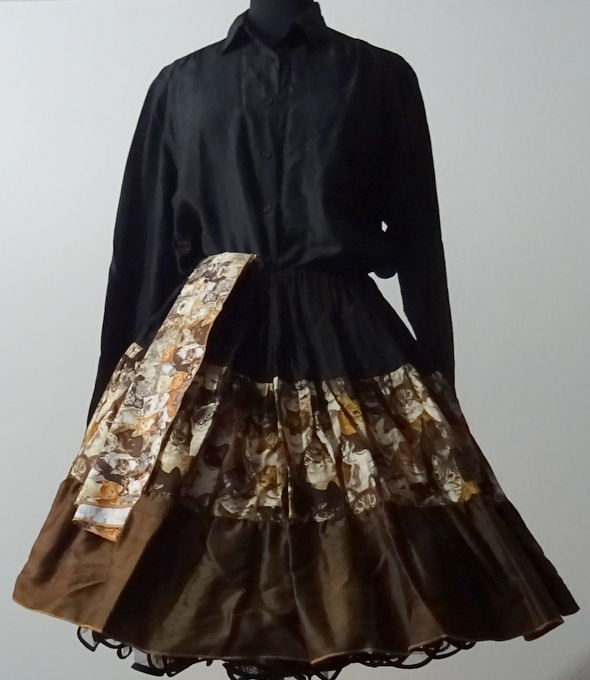 Rock: weitschwingender 3-Stufenrock der professionell genäht wurde die Stufen sind schwarz, Katzenmuster und olivgrün 3 cm breiter Gummibund in den Rock wurde innen ein Täschchen im Katzenmuster angebracht (11 cm x 13,5 cm)