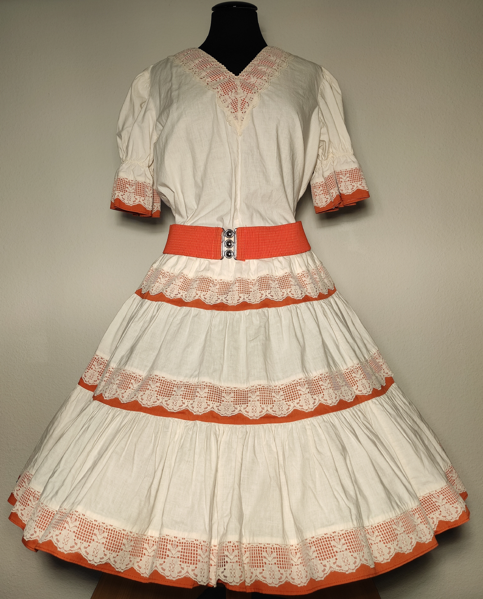 Rock: in 3 Stufen verarbeitet, zwischen jeder Stufe die Verzierung mit 6cm hellem Maron und der Spitze bei Kauf bitte Maße mitteilen, damit das passende Gummi eingezogen werden kann, max. Breite beachten