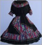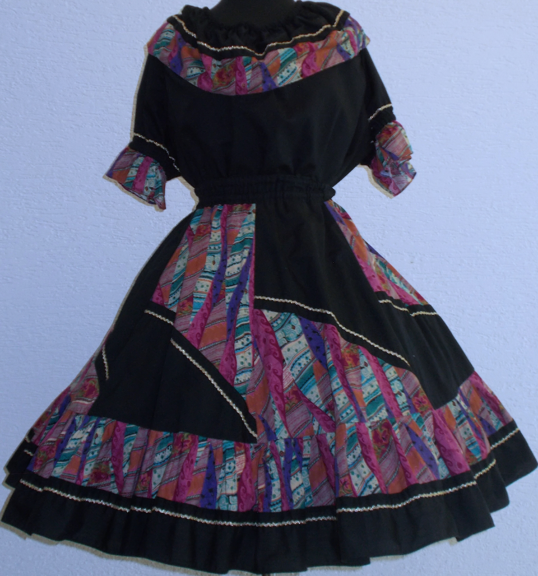 Rock: raffiniert genäht in 8 Bahnen jede Bahn als wechselnde Patches in schwarz und buntem Muster die schwarzen Patches sind verziert mit goldener Zackenlitze unten ein 18 cm langes Volant, aufgeteilt in buntem Muster 10 cm und schwarzem Volant in 9,5 cm ebenfalls verziert mit goldener Zackenlitze