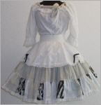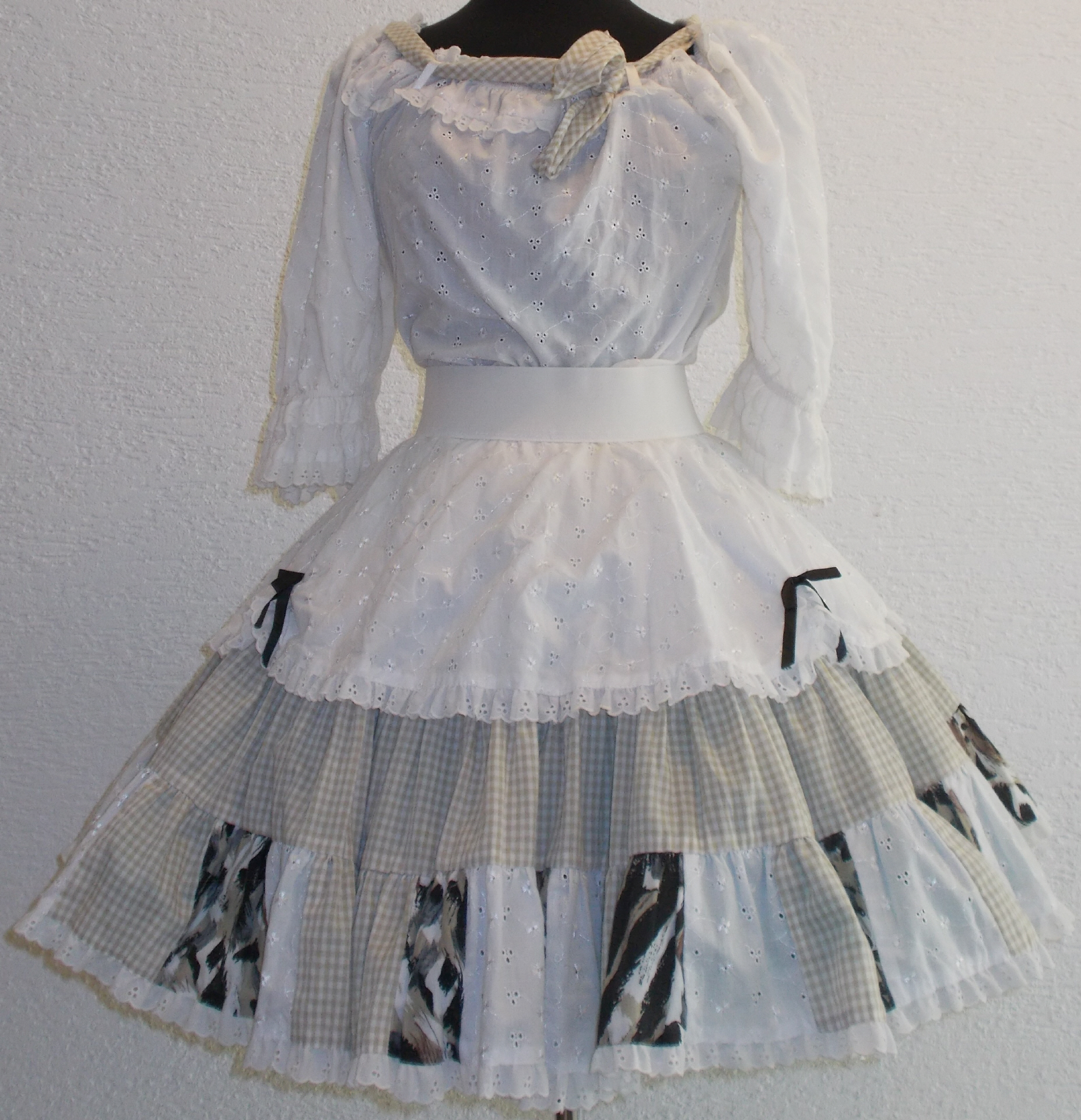 Rock: der Rock ist in 3 Stufen die oberste Stufe ist im gleichen Stoff wie die Bluse mit Lochstickerei und 2 schwarzen Satinschleifchen die 2. Stufe ist in dem beige- weissen Karostoff die 3. Stufe ist aus Patches: weiss, weis-beigenem, weiss schwarz-braun gemustert den Absachluss ziert eine 2 cm breite Spitze mit Lochstickerei