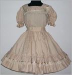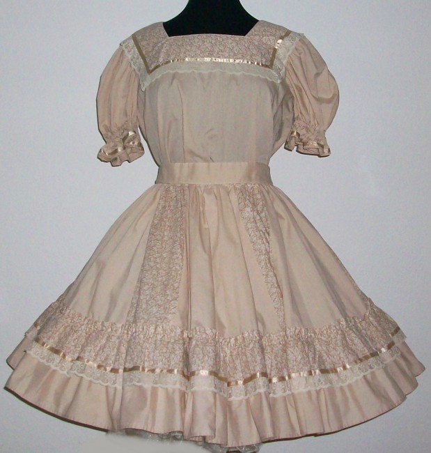 Rock in 13 Bahnen beiger Stoff und braun/beigegemusterter Stoff am Saum aus beigem Stoff 13 cm Volant gemusterter Stoff 11 cm Volan ebenfalls mit cremefarbenem Satinband und beiger Spitze hinten 17 cm Reissverschluss Bund nur minimal dehnbar