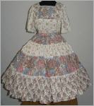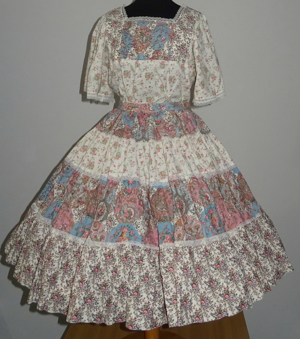 Rock: weitschwingender Stufenrock 3 cm starrer Bund hinten mit 17 cm langem Reissverschluss der Rock ist in 4 Stufen, jeweils verziert mit weisser Spitze die obere und mittlere Stufe sind in dem Muster rauchblau und altrosa mit Blumenmuster und Ornamenten die zweite Stufe ist eierschalfarben mit zarten Streublumen die untere Stufe ist eierschalfarben mit dichtem Rosenmuster