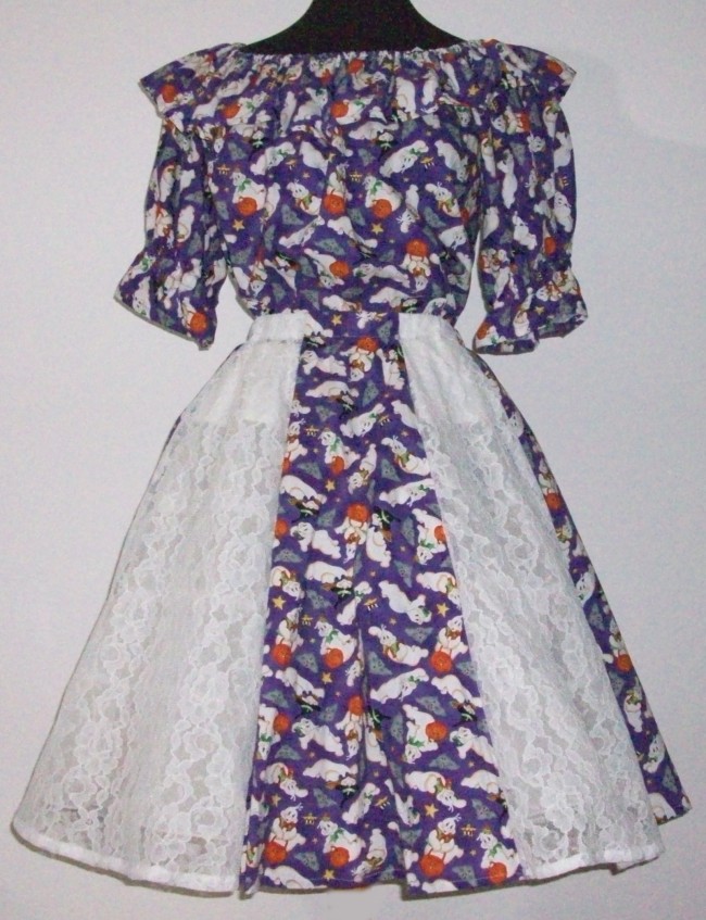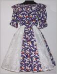 der Rock ist in verschieden, wechselnden Bahnen gleicher Stoff wie Bluse, dazwischen Bahnen aus weissem Spitzenstoff Gummibund