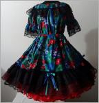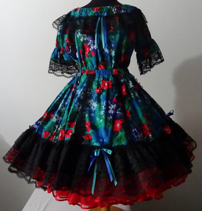 Rock: sehr weitschwingender Tellerrock jede Bahn mit 2,5 cm breiter schwarzer Spitze verziert 4 cm breiter Gummibund unten mit reichlich doppelter,edler, schwarzer, 19 cm breiter Spitze verziert ebenso verziert mit Satinschleifchen in blau und smaragd