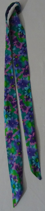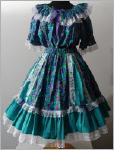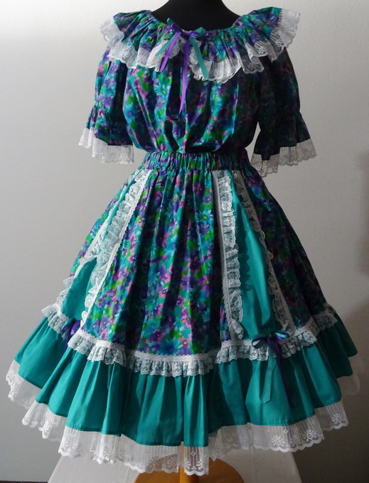 Rock: weitschwingender Bahnenrock in 8 Bahnen die Bahnen sind abwechselnd in den Farben der Bluse und einfarbig petrol, jeweils abgesetzt mit 3 cm breiter weisser Spitze die untere petrolfarbene Stufe von 14 cm ist ebenfalls verziert mit 4 cm breiter weisser Spitze, verziert mit 4 Schleifen aus lila- und türkisfarbenem Satinband befestigt mit je einer Sicherheitsnadel 4 cm breiter Gummibund