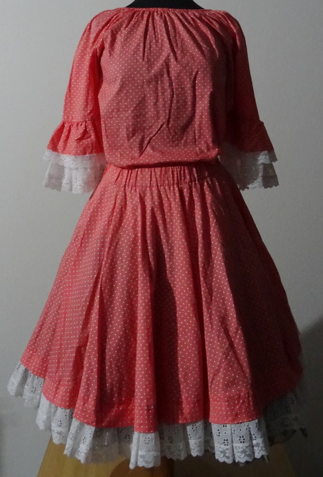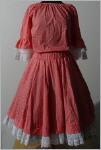 Bluse: runder Halsausschnitt mit Gummizug 42 cm lange Ärmel, reich verziert mit einem 8 cm langem Volant dass mit 3 cm weißer Spitze verziert ist darunter ein sehr aufwendiges Volant mit 11 cm breiter Spitze mit Lochstickerei