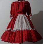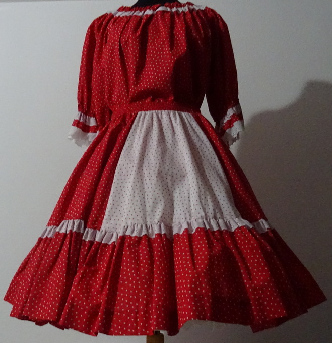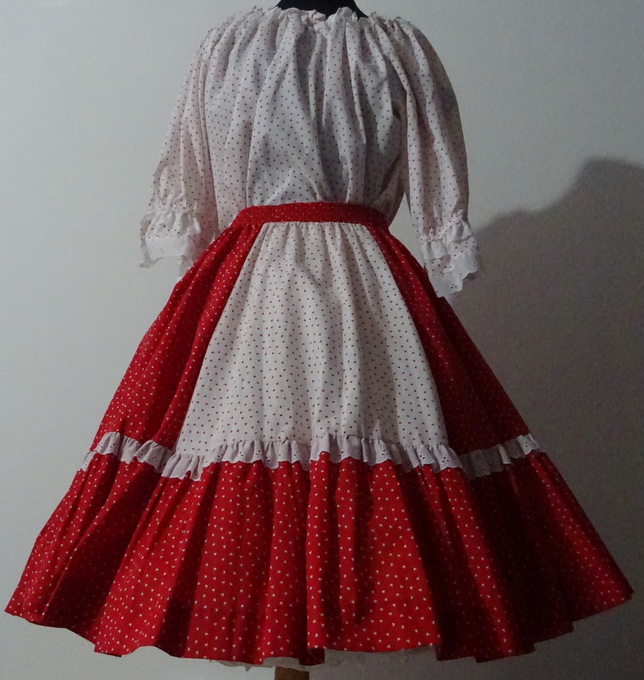 Rock in den Farben weiss und rot: weitschwingender Bahnenrock in 6 Bahnen unten ein 22 cm breites Volant verziert mit weisser Spitze 2,5 cm breiter Gummibund Grösse XL