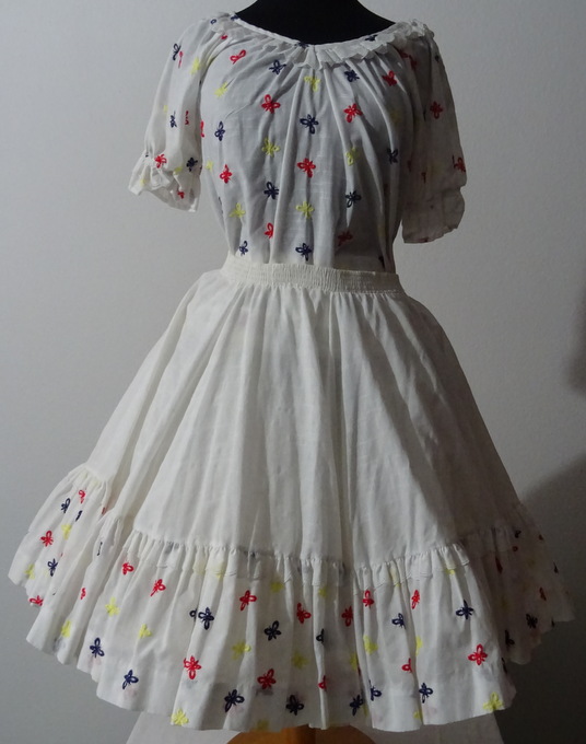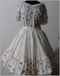 Rock: weitschwingender Tellerrock unten mit 18 cm Volant, verziert mit weisser Spitze das Volant ist mit Schmetterlingen bestickt (das Volant hat einen Saum und kann verlängert werden) 3 cm breiter Gummibund
