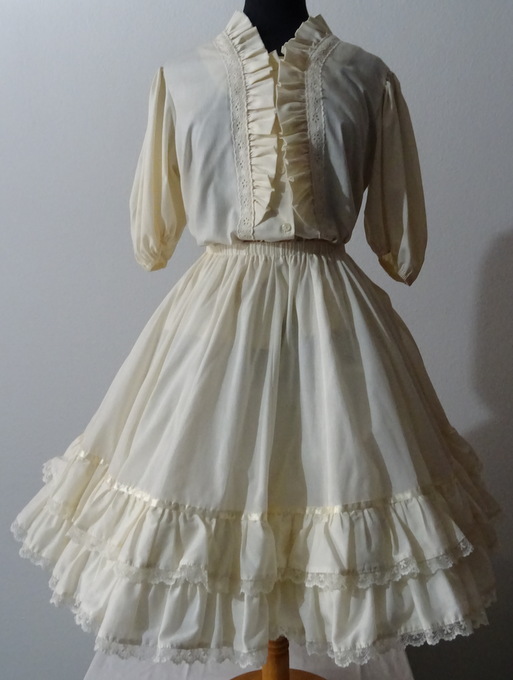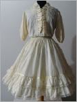Rock: weitschwingender Tellerrock unten 2 Volants jeweils 9 cm breit, verziert mit weisser Spitze 2 cm breiter Gummibund