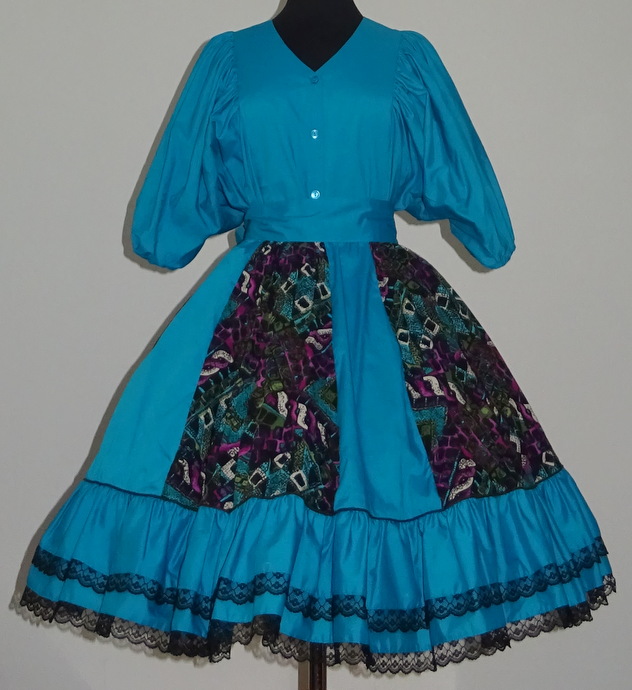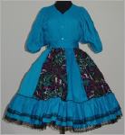 Rock: weitschwingender Bahnenrock in 10 Bahnen die Bahnen sind abwechselnd in uni türkis und gemustert die vordere Bahn ist mit schwarzer Spitze verziert unten mit 2-fachem Volant (17 cm und 12 cm) jeweils mit schwarzer Spitze verziert 3 cm breiter Gummibund