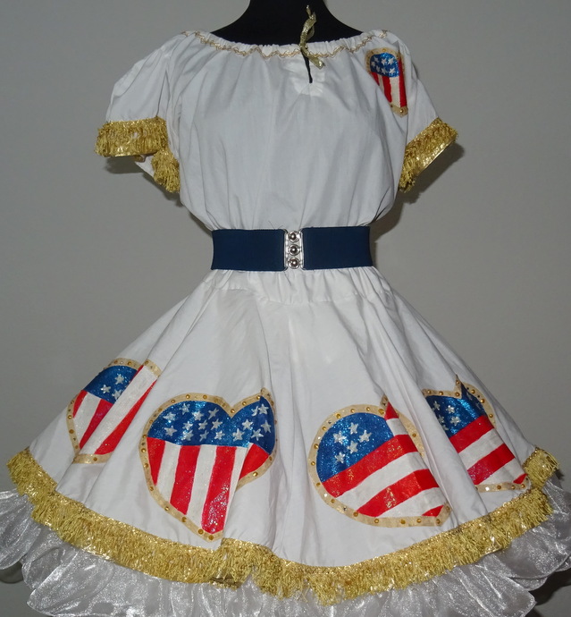 Rock: weitschwingender Bahnenrock in 8 Bahnen 2 cm breiter Gummibund auf jeder Bahn befindet ein Herz mit amerikanischer Flagge in der Größe von 24 x 19 cm den Saum schmückt (wie bei der Bluse) ein 4 cm breites Fransenband in gold