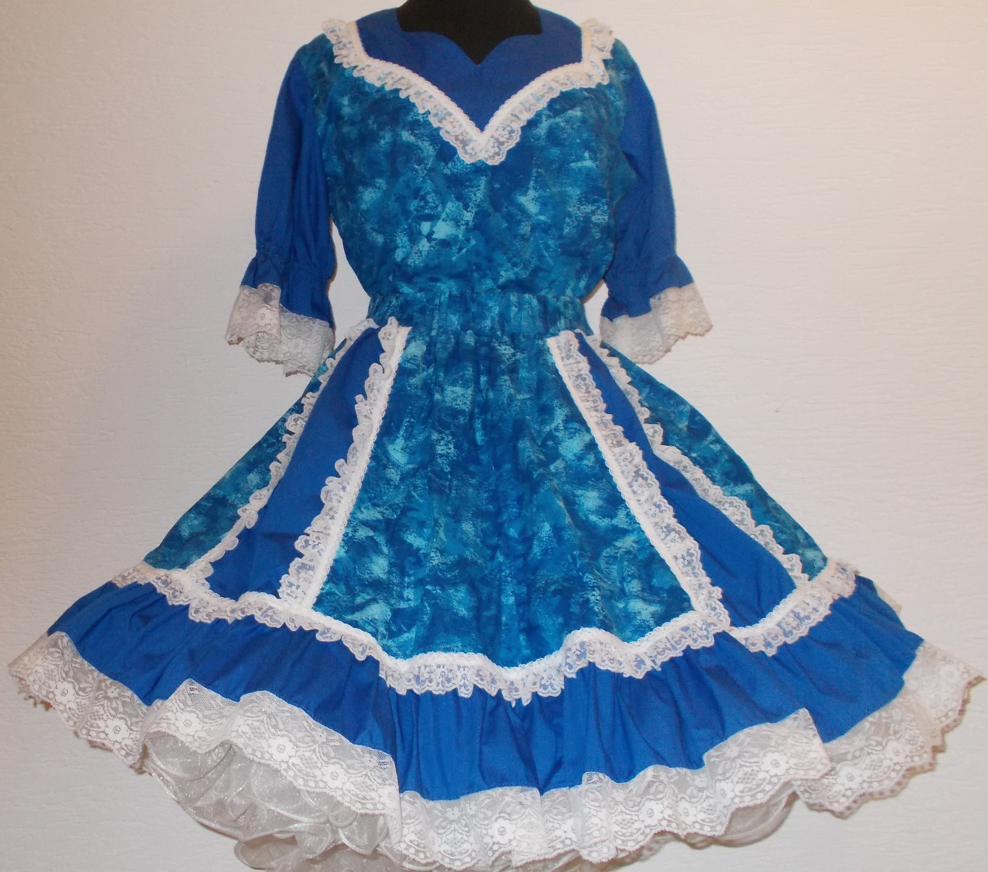 Bahnen in verschiedenen blau M;ustern, zwischendrin royalblaue Bahnen, verziert mit 4 cm breiter Spitze der Rock hat unten 11 cm royalblaues Volant und zusätzlich 6 cm weiße Spitze es wurde ein Innentäschchen angebracht das eingeknöpft werden kann in der Größe 12 cm x 13 cm