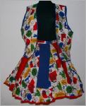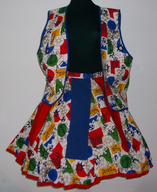 der Rock ist im gleichen bunten Muster vom Bund aus gehen blaue und rote Stoffstreifen unten ist der Rock mit rotem Schrägband eingefasst starrer Bund hinten 25 cm Reissverschluss
