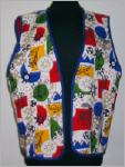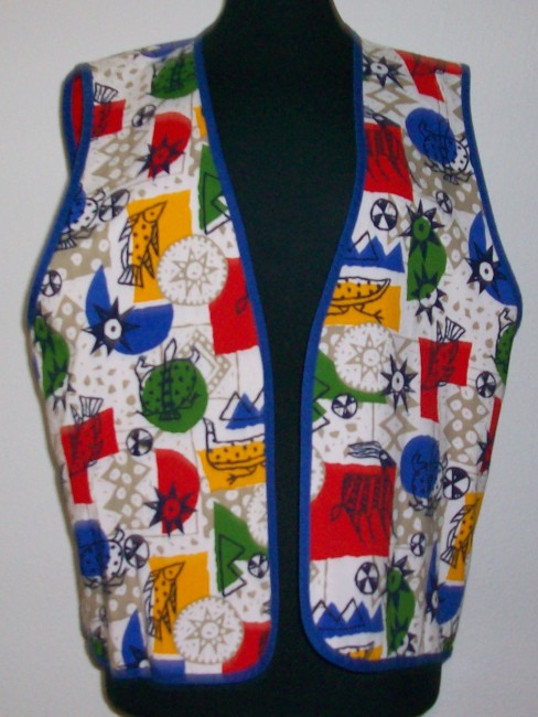 weisser Grund mit buntem Muster rot - gelb - grün - blau die Weste ist voll gefüttert in rot ringsum und um den Armausschnitt mit blauem Schrägband eingefasst