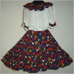 weisse Bluse mit rundem Ausschnitt mit Gummizug und 10 cm breiter Volant am Halsausschnitt aus dem Stoff des Rockes Puffärmel mit Gummizug und kleiner Volant aus dem Stoff des Rockes und weisses Satinband