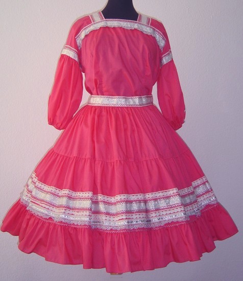 sauber verarbeitetes Unikat in pink die Bluse (am Halsausschnitt sowie an den Ärmeln) und der Rock (am Bund sowie im unteren Drittel) sind durch aufwändige, verschiedene Borten in Silber und Zackenlitzen in weiss/silber/pink verziert hinten 45 cm langer Reissverschluss Ärmellänge 38 cm leicht tailliert der 3-stufen Rock hat einen starren Bund (hinten mit 20 cm Reissverschluss)