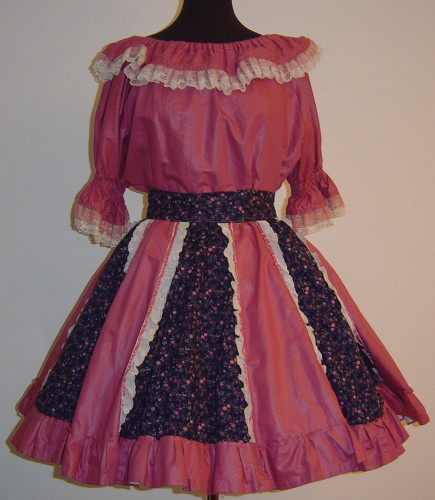 dunkel-altroséfarbene Bluse 12 cm breite Rüsche um den U-Bootförmigen Halsausschnitt mit Gummizug 4 cm beige Spitze 2 cm altrosé Spitze 37 cm lange Puffärmel (incl 5 cm beige Spitze und 3 cm altrosé Spitze) gerade geschnitten Rock mit starrem Bund Bund 6,5 cm breit, mit 2 Druckknöpfen geschlossen 10 Bahnen, abwechselnd dunkel-altroséfarbener Stoff, links und rechts verziert mit weisser Spitze und altroséfarbenem Satinband und dunkelblauem Stoff mit Streublumenmuster in altrosaBund aus dem gleichen Stoffaltrosa Volant am Saum 7,5 cm breit