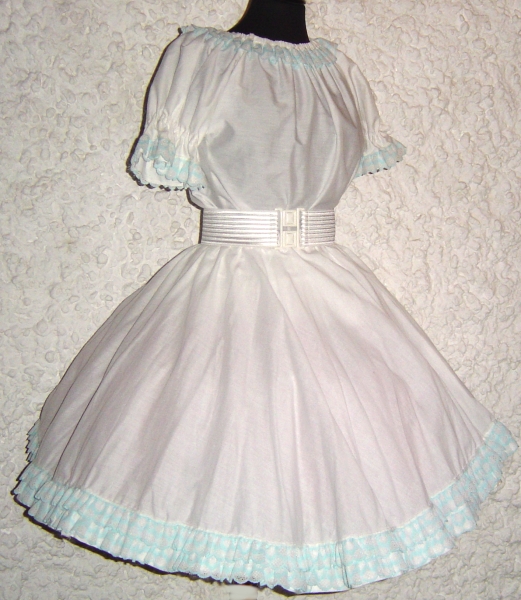Farbe weiss mit hellblauer und weisser Spitze am Rundhalsausschnitt am Puffärmel am Rockende doppelt weiter Tellerrock in Bahnenohne Gürtel