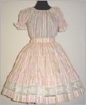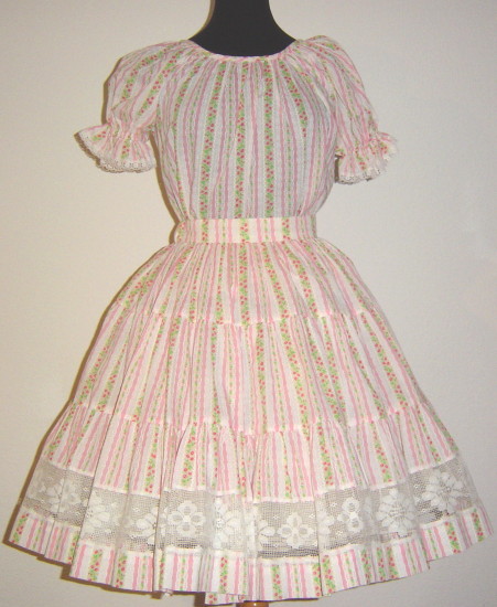 dürfte Grösse S sein gerade geschnittene Bluse mit kurzen Puffärmeln bedruckt mit Blümchenranken, weissem Spitzenmuster auf zart-rosa Hintergrund an den Ärmeln 1 cm weisse Spitze als Abschluss 3-Stufen-Rock im gleichen Druckmuster seitlich mit 14 cm Reissverschluss Bund 4 cm breit, mit Knopf verschliessbar die unterste Stufe ist durchbrochen mit einer 6 cm breiten Spitze der 5 cm breite Rocksaum kann ev. 4 cm heraus gelassen werden der Rock hat hinten 14 cm Gummizug, der ihn flexibler macht