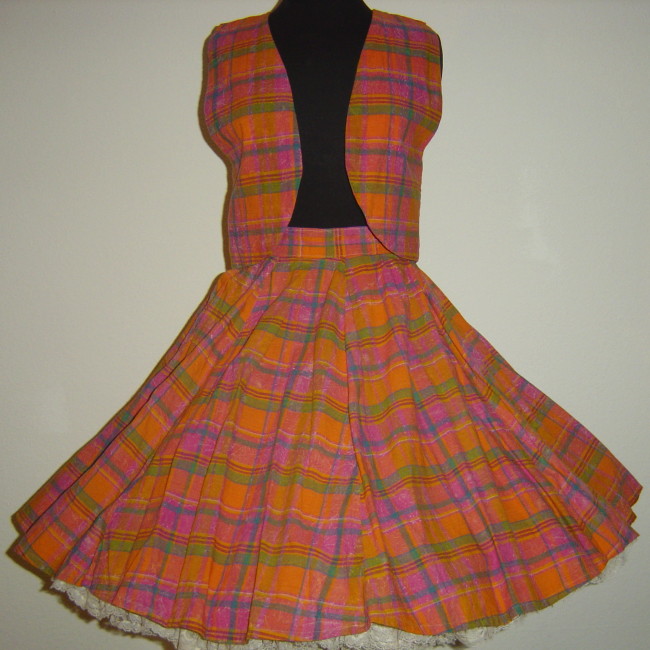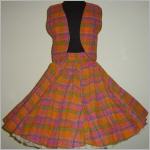 Zweiteiler in orange, grün und fuchsia kariertärmellose Weste im BolerostilStoff liegt doppeltTeller-Rock mit starrem Bundhinten 16 cm Reissverschluss