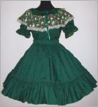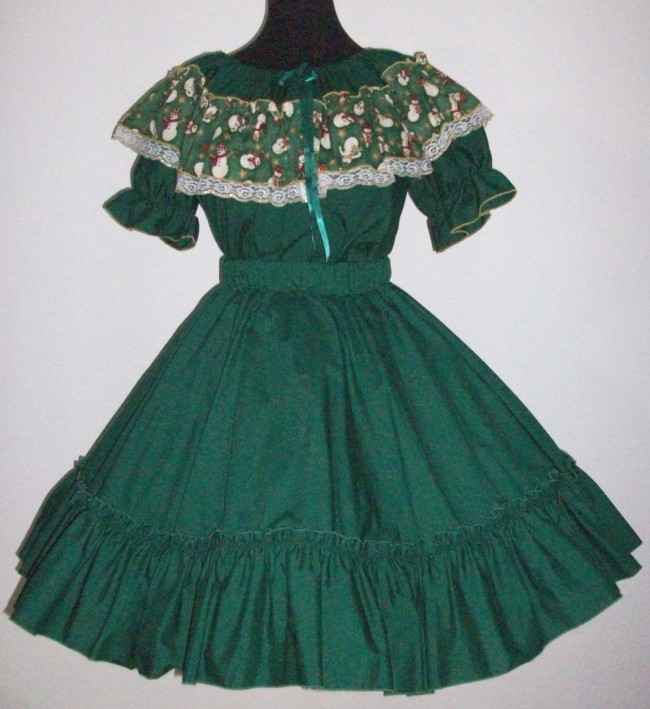 huntergrüne Bluse Grösse -S- der runde Halsausschnitt ist mit durchgezogenem Samtband enger zu machen ringsum verziert mit 14 cm breiten Volant, auf dem verschiedene Schneemännchen und Sterne zu sehen sind verziert mit weisser Spitze kurze Puffärmelchen 35% Polyester, 65% Cotton