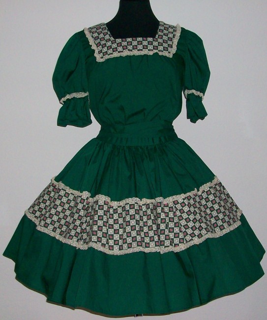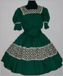 dunkelgrüner Zweiteiler Trapezausschnitt, verziert mit geblümten Stoff in creme-rosé-dunkelrot cremefarbene Spitze Ärmelchen mit Gummizug mit cremefarbener Spitze und 7 cm Volant