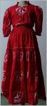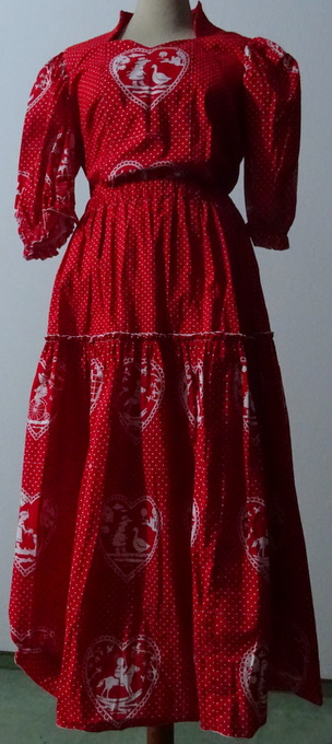 Bluse: vorne 2 große rot-weisse Herzen mit Gänse-Liesl und Schaukelpferd (Muster wiederholt sich in den Puffärmeln) spitz zulaufender Halsausschnitt 42 cm Puffärmel gerade geschnittene Bluse