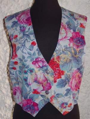 Grösse 38Farbe jeansblauRückenteil uni hellblauvorne 2 KnöpfeVorderteil mit Blumenmuster rot/purple/goldkomplett gefüttert100% BaumwolleOberweite 94 cmLänge 46 cm