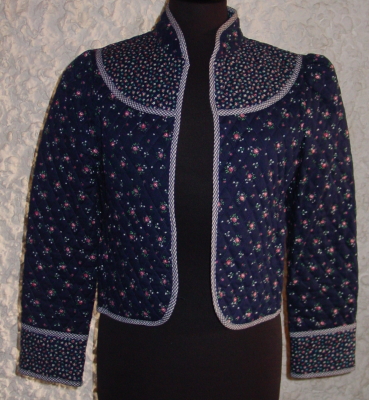 Jäckchen aus USA für die kälteren Tage Grösse S innen und aussen rautenförmig abgesteppt, wattiert Innenfutter bornit Aussenseite dunkelblau/geblümt mit Streublumenam Hals und an den Manschetten feines Streublumenmuster Oberweite 92 cm Länge 46 cm Ärmel 58 cm