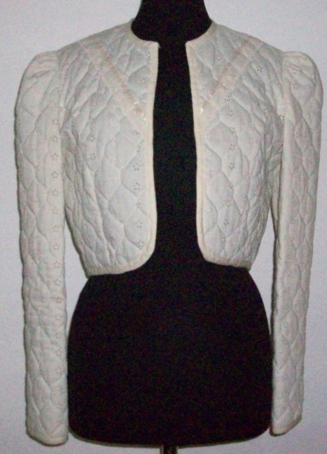 cremefarbenes Squaredance Kurz-Jäckchen mit Lochstickerei vorne v-förmig aufgenähte Spitze runder Halsausschnitt eingefasst mit Schrägband voll gefüttert und gesteppt langer Arm