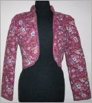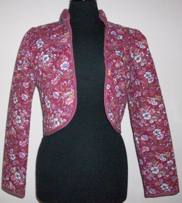 fuchsiafarbenes Squaredance Kurz-Jäckchen mit Blütenmuster in altrosa, bleu und flieder kurzes Stehkrägelchen voll gefüttert in dunkel Fuchsia mit kleinen weissen Pünktchen voll gesteppt langer Arm