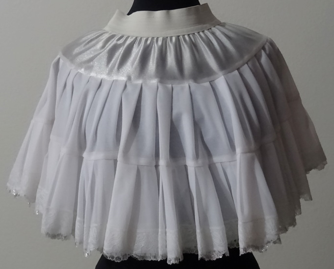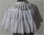 weißer Petticoat aus sehr weichem und geschmeidigem Net-Material 2-lagig, 2-stufig 4 cm breiter Gummibund Sattel in weißem schimmerndem Polyester Material die Stufen sind in den Längen 11,5 cm und 8,5 cm unten ziert das Ganze eine 4,5 cm edle Spitze mit Silberfaden durchzogen