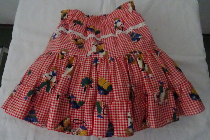 das Muster ist rot-weiss Karo mit Cowboys, Indianerzelten und Planwagen
