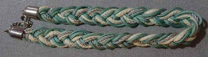 geflochtene Halskette in den Farben grün, weiss und silberdie Länge ist verstellbar und beträgt 38 cm - 42 cmdie Breite beträgt 2 cmsehr guter Zustand