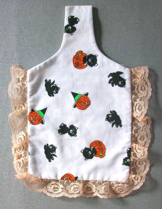 weisses Gürteltäschchen (Halloween)mit beigefarbener Spitzebedruckt mit Kätzchen und Kürbisen14 cm breit x 17 cm hoch (ohne Gürtelschlaufe)