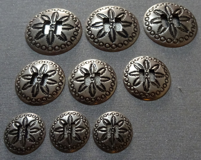 silberfarbenes Concho mit Blumenmusterin 3 verschiedenen Größen (5 cm / 4 cm / 3 cm Durchmesser)jeweils 3 mal vorhandenPreise pro Stück:5 cm: 3,00 €4 cm: 2,00 €3 cm: 1,00 € NEU