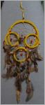 verziert mit dunkelroten Holzperlen und verschiedenen braunen Federn