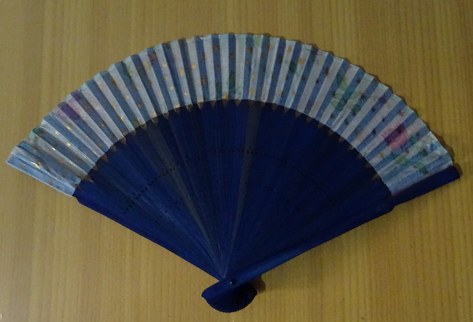 wunderschöner zierlicher Fächer aus filigranen blauen Holzstäbchenbespannt mit hellblauem Stoff mit goldfarbenem Sternchenmusterder Fächer eignet sich aufgrund seiner Grösse perfekt für KinderGröße aufgespannt: H. 22 cm, B. 38 cmNeu