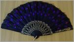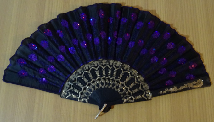wunderschöner Fächer mit schwarzen Stäbchenbespannt mit schwarzem Stoff und bestickt mit lilafarbenen PaillettenGröße aufgespannt: H. 24 cm, B. 45 cmNeu