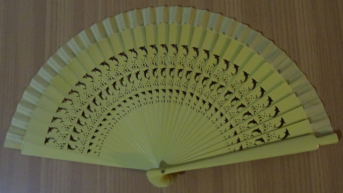 wunderschöner Fächer in gelb lackiertverziert mit eingestanzten DelphinenGröße aufgespannt: H. 23 cm, B. 43 cmNeu