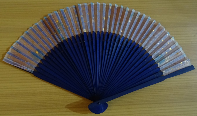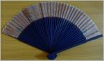 wunderschöner zierlicher Fächer aus filigranen dunkelblauen Holzstäbchen bespannt mit hellem rosafarbenem Stoff mit goldenem Sternchenmuster