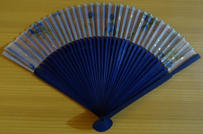 wunderschöner zierlicher Fächer aus filigranen dunkelblauen Holzstäbchen bespannt mit hellem rosafarbenem Stoff mit goldenem Sternchenmuster und blauen Blumen