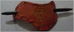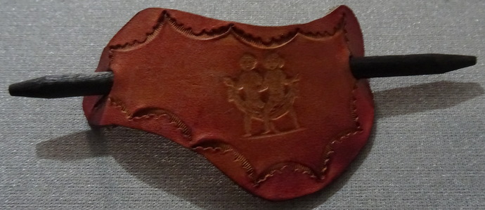 Haarspange aus braunem Echt-Leder mit eingestanzten Ornamenten und ZwillingspärchenMaße: 9 cm x 4,3 cmwie NEU