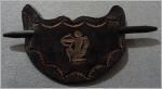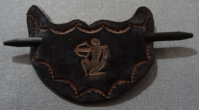 Haarspange aus sehr dunkelbraunem Echt-Leder mit eingestanztem Schützen und gewelltem RandMaße: 9 cm x 5 cm