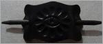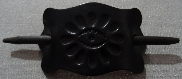 Haarspange aus schwarzem Echt-Leder mit eingestanzter Blüte mit Auge und gewelltem RandMaße: 9,3 cm x 5 cmwie NEU