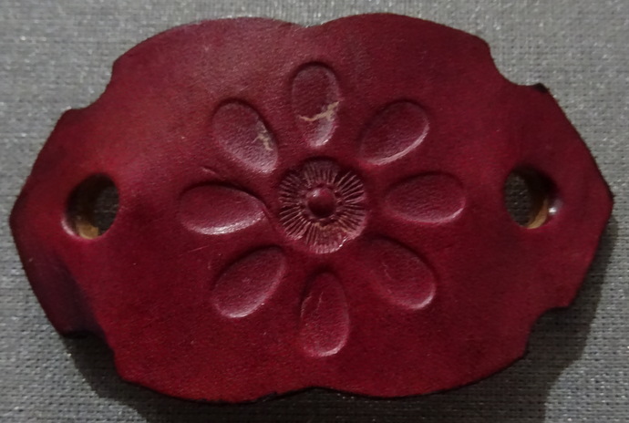 Haarspange aus dunkelrotem Echt-Leder mit eingestanzter Blüte und gewelltem RandMaße: 7,8 cm x 4,4 cmguter Zustand