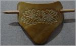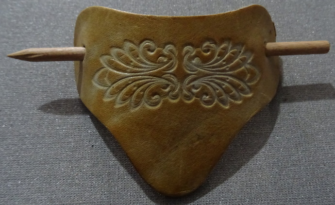 Haarspange aus beigefarbenem Echt-Leder mit eingestanzten OrnamentenMaße: 10 cm x 6,5 cm2 mal vorhandenwie NEU